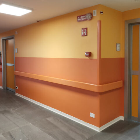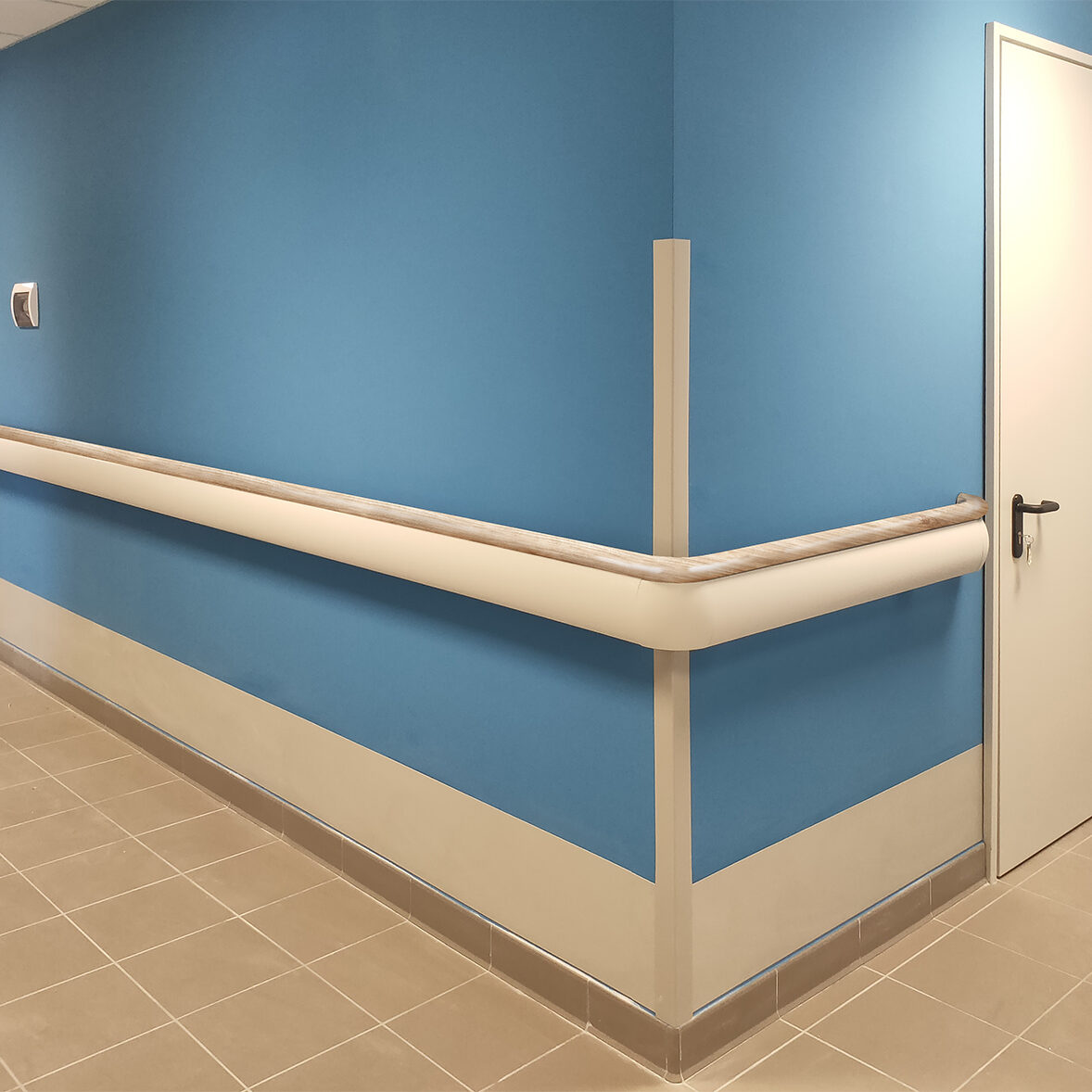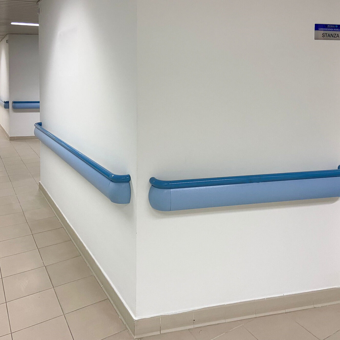 Life-blend® bumper handrail (h 140 mm) classically designed, with a slight embossed finish able to resist to scratches and to guarantee a perfect hygiene and cleanliness.