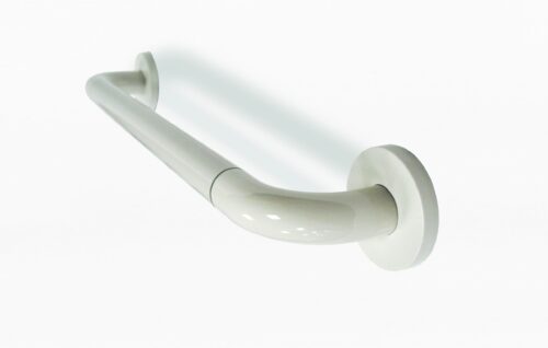 Maniglione di sicurezza realizzato con anima rettilinea in acciaio portante trattato anticorrosione e rivestito in poliammide di prima scelta colorata in pasta, supporti a parete dritti, fissaggio a parete a mezzo di flangia coperta da copriflangia.